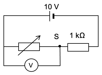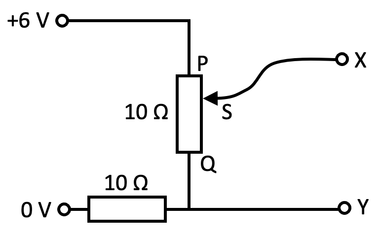 | A variable potential divider has a sliding contact S that can be moved between end P and end Q of a 10 Ω resistor. The potential divider is connected to a constant 6.0 V power supply and another 10 Ω resistor, as shown below.