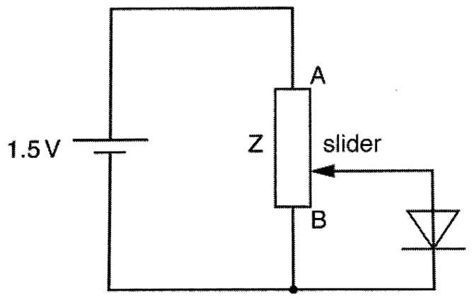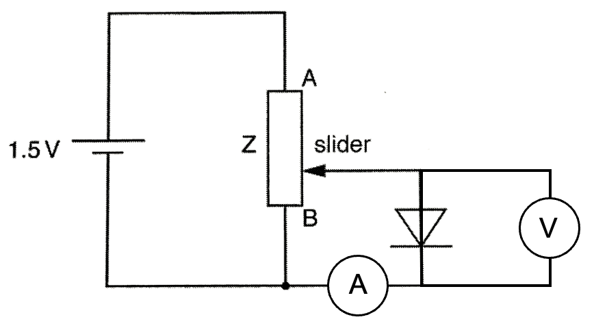 A student takes measurements of current and voltage to plot the I/V characteristic graph of a diode. The student connects the diode to the circuit containing a 1.5 V cell and a variable resistor Z, as shown in the diagram below. By adjusting the slider, the potential difference across the diode is altered. (a) State the name of the device obtained by using the variable resistor in this way.