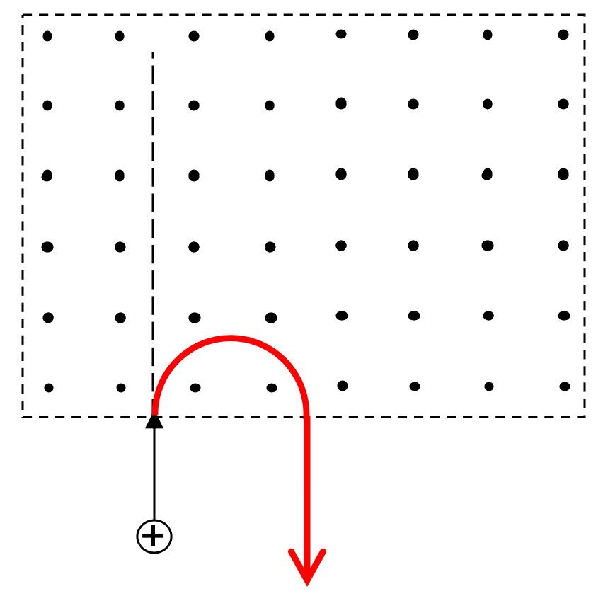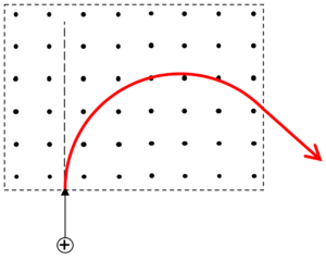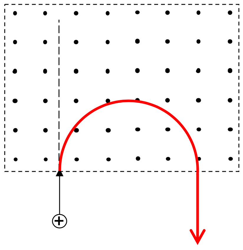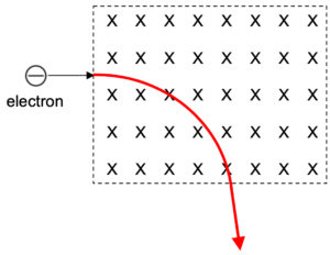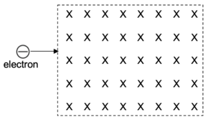 | The diagram shows an electron moving into a region of uniform magnetic field. Draw the path of the electron in the magnetic field.