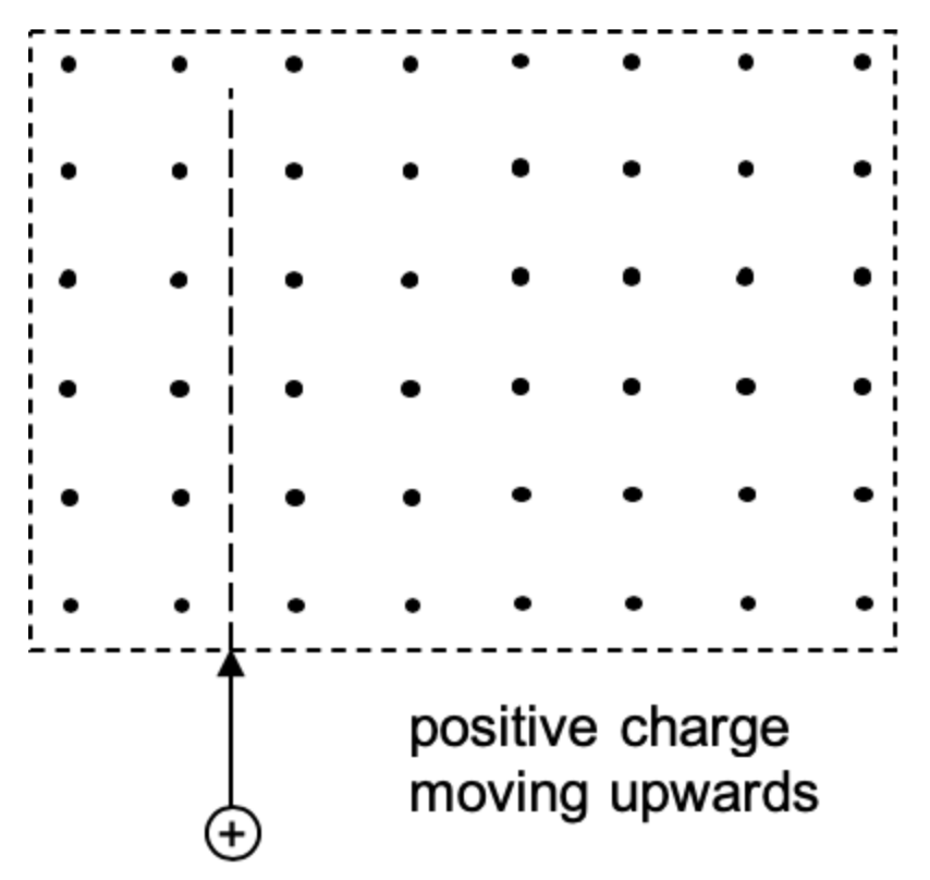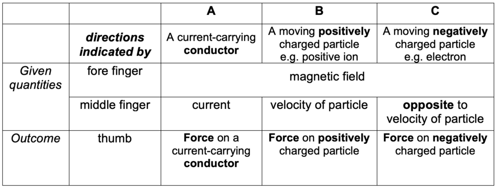 A current is simply charges (electrons) moving through a wire. So it shouldn’t be surprising that a charged particle moving through a magnetic field will experience a force. The force on the moving charged particle can be determined using Fleming’s left hand rule.