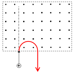 As a beam of positively or negatively charged particles enters a magnetic field, the charged particle inside the magnetic field will experience a force acting on it and this force will always be perpendicular to the direction of its motion. Hence, its path in the magnetic field is an arc of a circle.