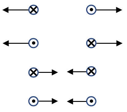 This can be simply remembered as wires with current in the same direction (like currents) will attract; wires with current in opposite direction (unlike currents) will repel.