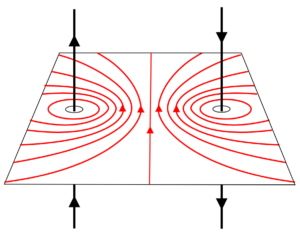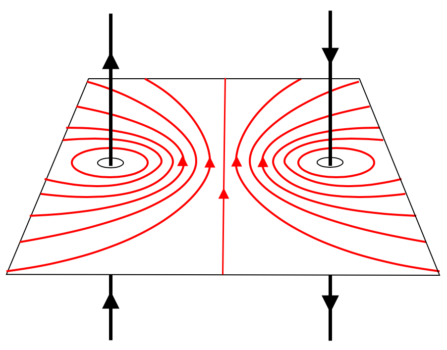 In this case the magnetic field between two wires, with currents in opposite directions, shows a greater field strength (higher concentration of lines) in the region between the two wires, resulting in the wires being pushed away from each other.