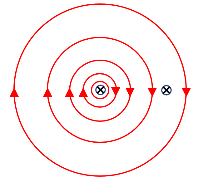 Of course the left wire itself is also generating a magnetic field that passes thought the right wire like this: