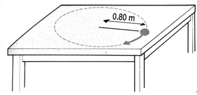 The figure below shows a mass of 0.300 kg rotating in a circular path of radius 0.80 m on a friction-free table. It is attached by a string to a peg at the centre of the circle. What is the force which the string exerts on the mass when the mass is moving at a constant speed of 3.45 m/s? Centripetal force is provided by the tension in the string, T. F = m a F = m v2 / r T = 0.300 x (3.45)2 / 0.80 T = 4.46 N |
