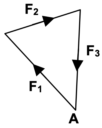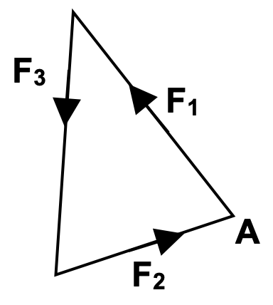 Draw a vector diagram to show the addition of these 3 forces. Knowing that the object is in equilibrium we know that the resultant force is zero and so a force addition diagram will result in a closed triangle. Starting from a point A we can first draw F1 followed by F2 and then F3 and we will end up with the following closed triangle. Alternatively we could have started from A and drawn F1 followed by F3 and then F2 and we would still end up with a closed triangle. You can probably figure out what the triangles would look like for other orders of drawing the 3 forces. |