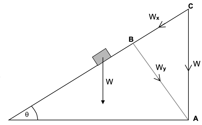 - Use the upper end of the slope (on the right) to draw the triangle ABC. Draw arrows to show W and its two components.