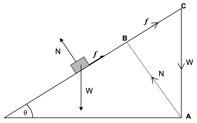 - Use the upper end of the slope (on the right) to draw the triangle ABC. Draw arrows to show W, f and N.