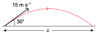 | A football is kicked on level ground at a velocity of 15 m s-1 at an angle of 30° to the horizontal.
