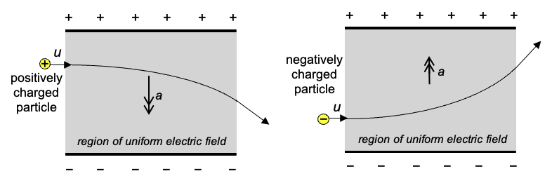 - Hence, if the charged particle enters the electric field with a velocity u at right angles to the direction of the acceleration, the particle will follow a parabolic path.