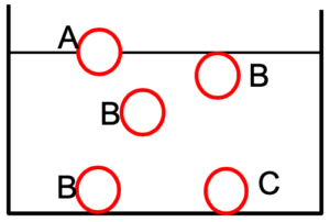 As ball A seems to be exactly half in the water we can assume its density is 0.5 g cm-3 – i.e. exactly half that of water.