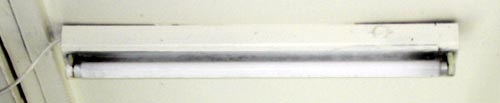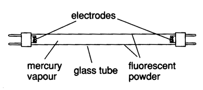 A fluorescent bulb uses a completely different method to produce light. In a fluorescent tube there are electrodes at both ends of the tube and a gas containing argon and mercury vapor within the tube. A stream of electrons flows through the gas from one electrode to the other. These electrons bump into the mercury atoms and excite them. As the mercury atoms move from the excited state back to the unexcited state, they give off ultraviolet light. This UV light hits the phosphor coating the inside of the fluorescent tube, and this phosphor creates visible light.