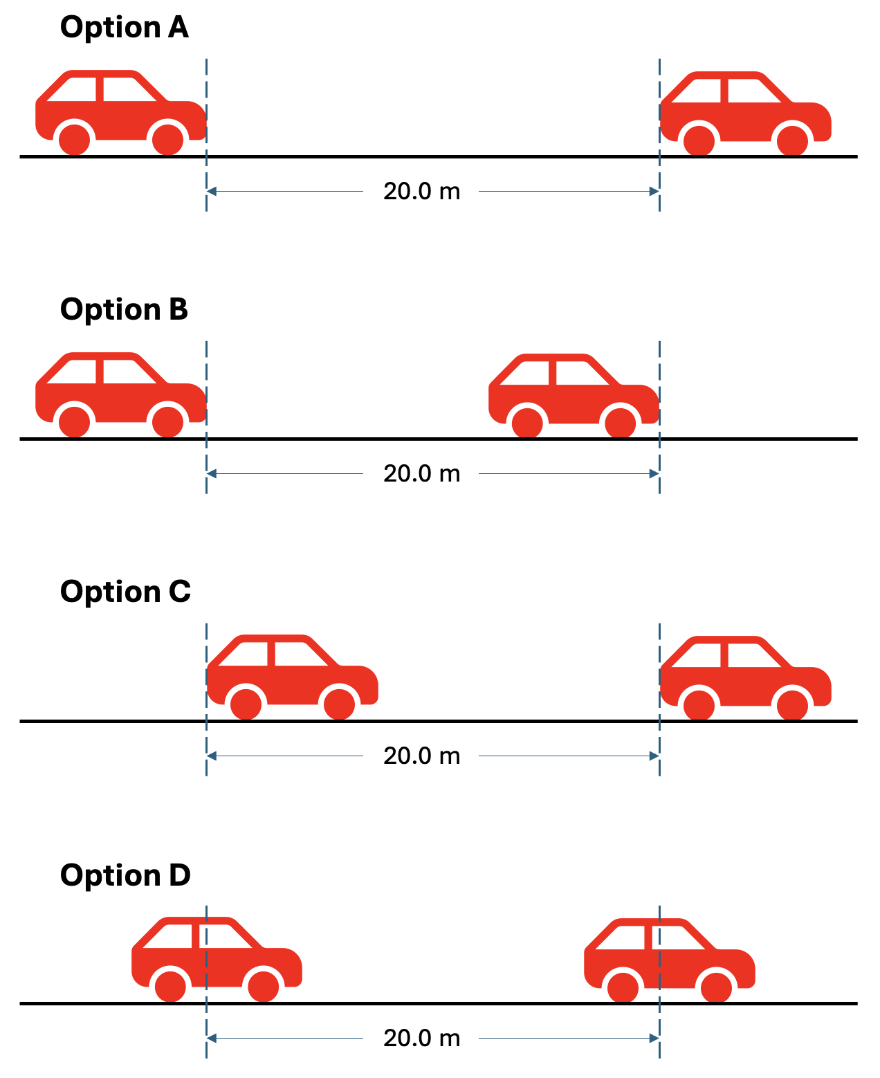 Option B, Option C and Option D are all showing the car moving a distance of 20.0 m. So, are they equally valid ways to measure the time, or does any method have an advantage?