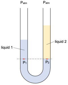 Note that although both sides of the U-tube are at atmospheric pressure the levels of the two liquids are at different heights. This happens because the two liquids have differing densities.