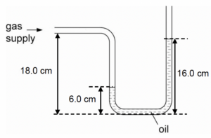 | A manometer is used to measure the pressure of a gas supply as shown in the diagram.