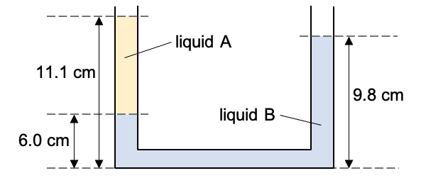 | Two immiscible liquids A and B of different densities are in equilibrium in an open U-tube of uniform cross-section as shown below.