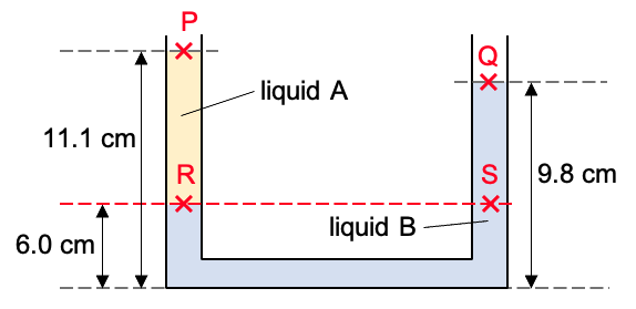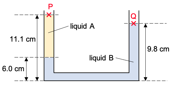 (a) On the diagram, clearly mark with a cross (without calculation) and label two points, P and Q, one in each side of the U-tube, where the pressure is equal to atmospheric pressure. (b) If liquid B is water, calculate the density of liquid A. |