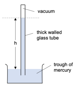 | The following barometer is reading an atmospheric pressure of 76.0 cm Hg. What is this in pascals given the density of mercury to be 13 600 kg/m³? ![]() |