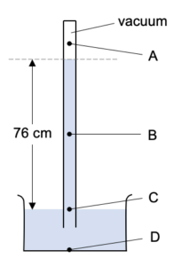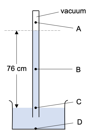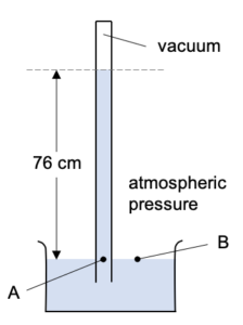 Pressure at A is caused by it being under 76 cm of mercury. There is a vacuum above it so this doesn’t add anything to the pressure.