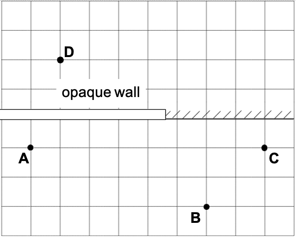 B is three squares in front of the mirror and so its image, B’, will appear three squares behind the mirror.