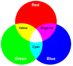 The three primary colours of light are red, green, and blue (RGB). Adding light together (mixing light) gives different results from mixing paints (pigments).