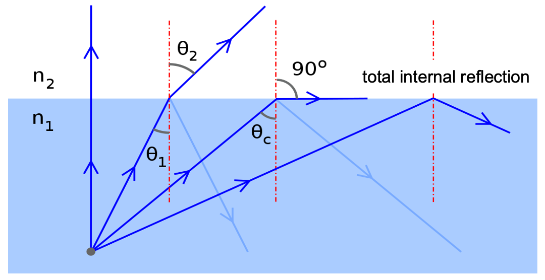 - The phenomenon where light is completely reflected is known as total internal reflection (TIR).