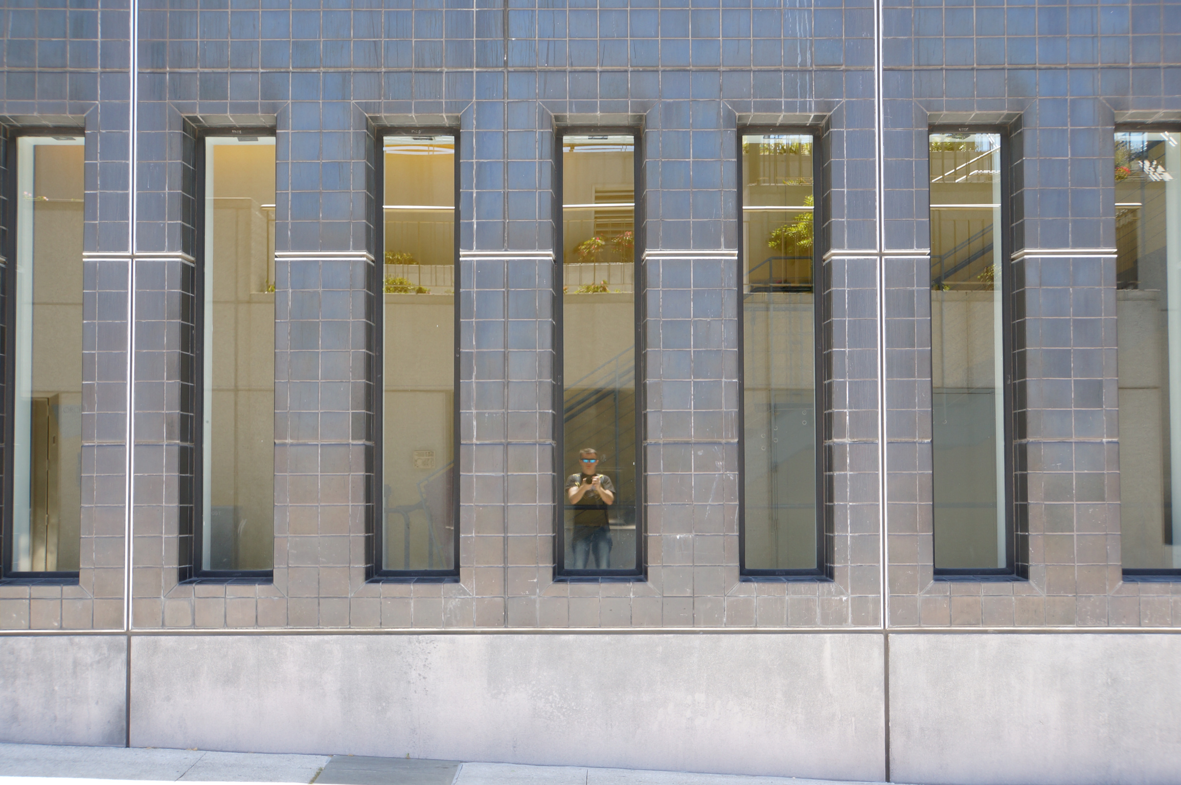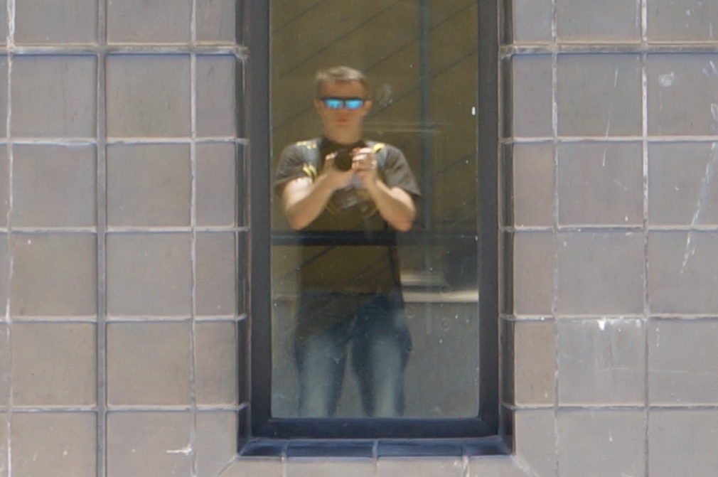 In this photo (and the closeup section below) you will see my reflection as I take a picture of the building from the outside.