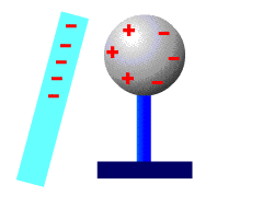 A charged rod (blue) is brought close to a conductor (sphere). Charges in the conductor separate.