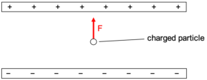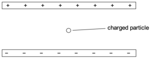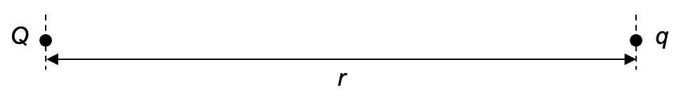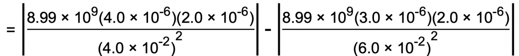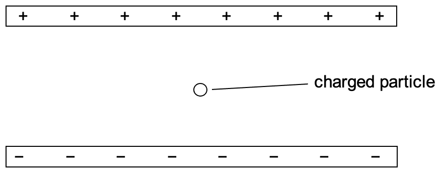 | A positively charged particle Q₁ has charge of 3.0 × 10−15 C. Another positively charged particle Q₂ has charge of 5.0 × 10−15 C. The two charged particles are placed 5.0 cm apart.