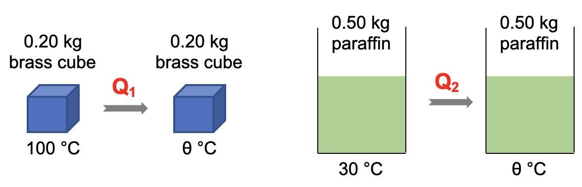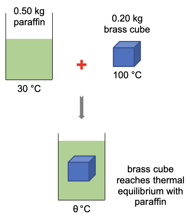 A brass cube of mass 0.20 kg at 100 °C is transferred into a container with negligible heat capacity containing 0.50 kg of paraffin at 30 °C. Calculate the final temperature of paraffin, assuming there is no energy loss to the surroundings. Given: |