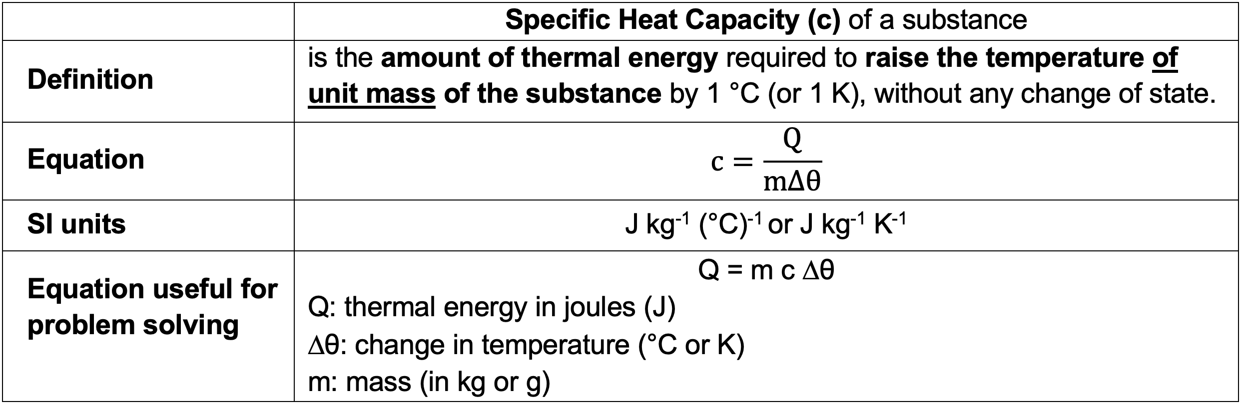e.g. for water, c = 4200 J kg-1 K-1 or 4.2 J g-1 K-1