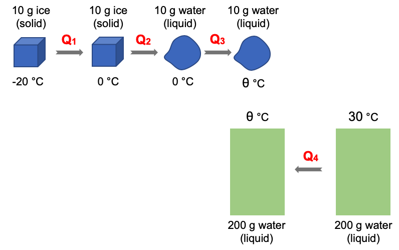 The ice is at –20.0 °C while the water is at 30.0 °C. Given: specific heat capacity of water = 4200 J (kg °C)-1 Find the final temperature of the mixture. |