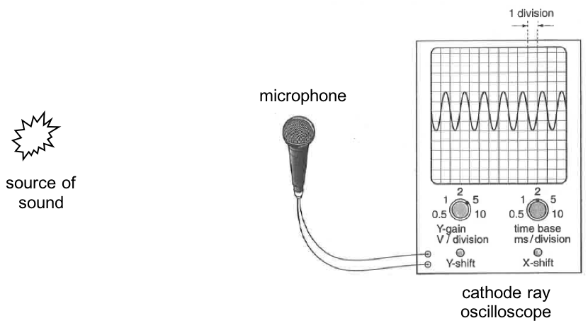 - When a sound travels to a microphone connected to an oscilloscope, the microphone converts the sound energy into electrical signals. The oscilloscope displays the waveform of the signals on a screen.