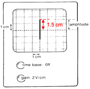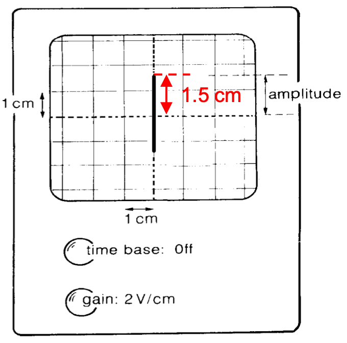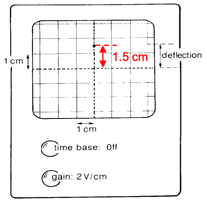 This oscilloscope is showing a voltage of 1.5 cm × 2 V/cm = 3.0 V