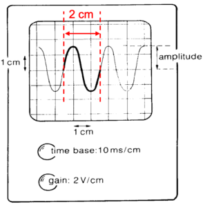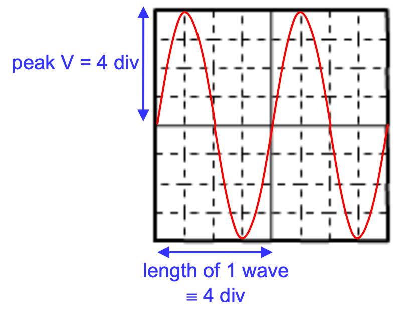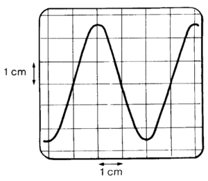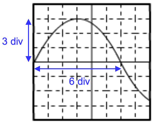 This oscilloscope is showing a peak-peak voltage of 3.0 cm × 2 V/cm = 6.0 V