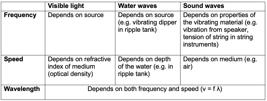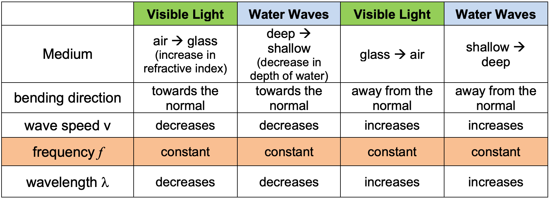 - Both visible light and water waves are transverse waves. They have similar behavior when they undergo refraction. The comparison is indicated in the following table: