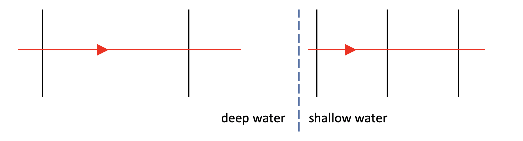 The same situation shown from above. Only the wavefronts would be seen here. Again it is easy to see the reduced wavelength.