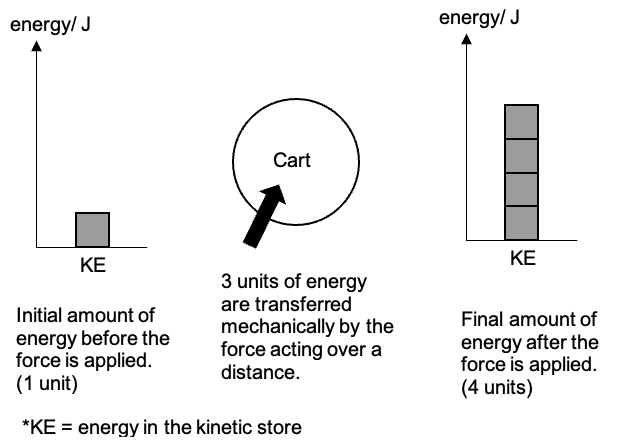 | A cart that is pushed by a constant force moves horizontally over a distance at increasing speed. The force transferred energy to the cart mechanically and caused the cart to increase its energy in the kinetic store and speed.