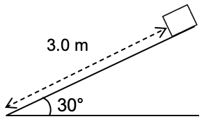 | If an object of mass 3.0 kg slides 3.0 m down a smooth plank slanted at an angle of 30° to the horizontal, what is its loss in gravitational potential energy? |