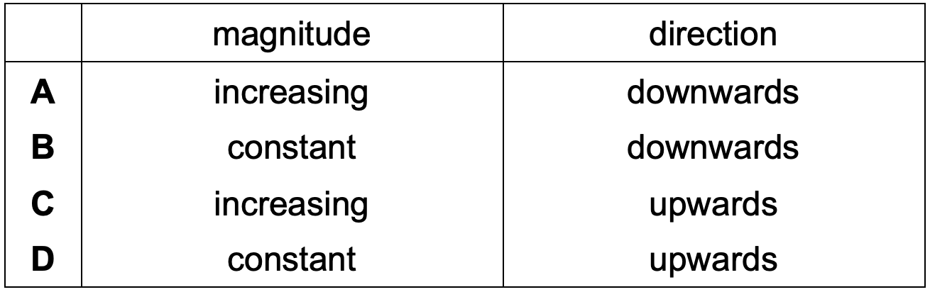 Revision: Dynamics Report a question What's wrong with this question? You cannot submit an empty report. Please add some details. 06 Dynamics - Revision Quiz Test your understanding of Dynamics here: 1 / 5 1) The diagram below shows the forces acting on an aeroplane. Which of the following is correct when the aeroplane is descending with a constant horizontal speed and an increasing vertical speed? Drag = Thrust and Lift < Weight Drag = Thrust and Lift > Weight Drag > Thrust and Lift < Weight Drag < Thrust and Lift = Weight 2 / 5 2) A box is moving horizontally at a constant speed towards the right along a smooth ground, and is about to enter a region where the ground is rough. What is the motion of the box as it moves onto the rough ground? The object continues moving at constant lower speed. The object stops immediately before the rough ground. The object decelerates to a stop then accelerates in the opposite direction. The object decelerates to a stop then remains at rest. 3 / 5 3) Which of the following cannot be the magnitude of the resultant force when two forces of magnitudes 7.0 N and 13.0 N act on an object? 13.0 N 10.0 N 5.0 N 20.0 N 4 / 5 4) A tension of 6000 N is experienced by the elevator cable of an empty elevator moving upwards with an acceleration of 2.0 m s-2. What is the mass of the elevator? 12000 kg 500 kg 750 kg 3000 kg 5 / 5 5) A man throws a stone vertically upwards. Ignoring the effect of air resistance, which row describes the magnitude and direction of the force acting on the stone after it leaves the man's hand? B A D C Your score is Restart quiz