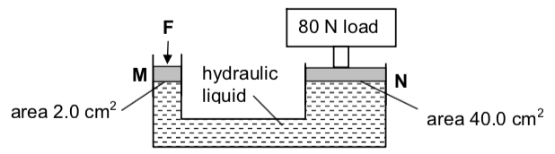 Revision: Pressure Report a question What's wrong with this question? You cannot submit an empty report. Please add some details. 09 Pressure - Revision Quiz Test your understanding of Pressure here: 1 / 5 1) The¬†diagram below shows the structure of a simple hydraulic lift. When a force F is applied at M, a force is set up at N to lift a load. What is the magnitude of force F exerted in order to lift a load of 80N at N? 1600 N 80 N 4.0 N 1.0 N 2 / 5 2) The diagram shows a simple mercury barometer. When the mercury barometer is brought to the top of a mountain, the height h of the mercury column decreases. Which statement explains this? The pressure in the space above the mercury column has increased. Some mercury has evaporated. Atmospheric pressure has increased. There is less air above the mountain. 3 / 5 3) The diagram shows a faulty barometer which has air trapped above the mercury in the tube. H is measured from the surface of the mercury in the reservoir to the surface of the mercury in the tube. If the tube is slightly lowered into the reservoir, the distance H will increase then decrease decrease remain the same increase As the tube is pushed down the trapped air will increase in pressure. 4 / 5 4) A sink is filled to a depth of 0.20 m with a liquid of density 1100 kg/m–3. The gravitational field strength is 10 N/kg. What is the pressure on the base of the sink due to the liquid? 2200 Pa 11 000 Pa 22 Pa 220 Pa P =h ρ g = 0.20 x 1100 x 10 = 2200 Pa 5 / 5 5) One side of a vertical garden fence has an area of 4.0 m2. A strong wind blows on one side of the fence and increases the pressure to 105 kPa. The pressure on the other side of the fence is 103 kPa. What is the resultant force on the fence? 8 000 N 500 N 16 000 N 420 000 N Your score is Restart quiz
