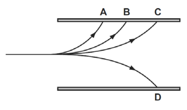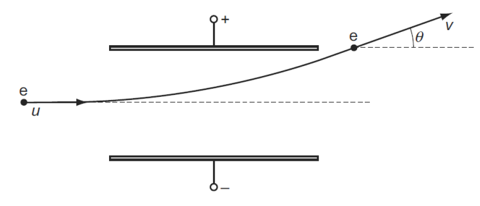 Revision: ADVANCED PHYSICS – Electric Fields Report a question What's wrong with this question? You cannot submit an empty report. Please add some details. Advanced Physics: Electric Fields - Revision Quiz Test your understanding of Advanced Physics: Electric Fields here: 1 / 5 1) An electron enters the space between two parallel charged plates with an initial velocity u. While in the electric field, its direction changes by θ and it emerges with a velocity v. What is the relation between v and u? v = u / cosθ v = u / sinθ v = u sinθ v = u cosθ 2 / 5 2) X and Y are two identical conducting spheres separated by a distance d. X has a charge +6.0 μC and Y has a charge –2.0 μC. The electric force on Y is −F (i.e. attractive). The spheres are touched together and are then returned to their original separation d. What is the force on Y now nearest to? –F +F –F / 3 +F / 3 3 / 5 3) The diagram shows an insulating rod with equal and opposite point charges at each end. An electric field of strength E acts on the rod in a downwards direction. Which row is correct? A C D B 4 / 5 4) Two charges –q and +q are placed at a distance 2d apart. What is the electric field strength at X, a distance d away from +q? 5 / 5 5) A single proton travelling with a constant horizontal velocity enters a uniform electric field between two parallel charged plates. In the diagram, B shows the path taken by the proton. Which path is taken by a helium nucleus (two protons and two neutrons) that enters the electric field at the same point and with the same velocity as the proton? D A B C Your score is Restart quiz