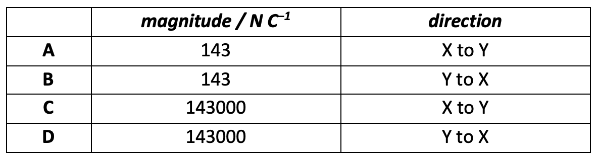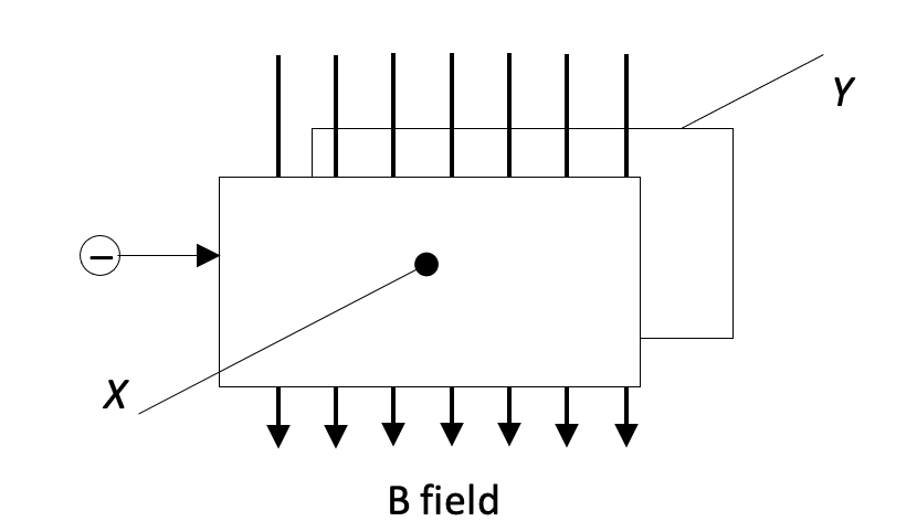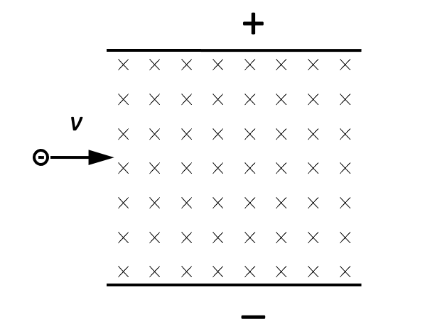 Revision: ADVANCED PHYSICS – Magnetic Fields Report a question What's wrong with this question? You cannot submit an empty report. Please add some details. Advanced Physics: Magnetic Fields - Revision Quiz Test your understanding of Advanced Physics: Magnetic Fields here: 1 / 5 1) The diagram shows an electron beam entering the region between two metal plates in which there are uniform electric and magnetic fields. If the speed of the electrons in the beam is 6.00 × 105 m s−1, and the strength of the magnetic field is 0.238 mT, what is the magnitude and direction of the electric field that will allow the beam to pass through undeflected? D B A C 2 / 5 2) An electron enters a region where there are uniform electric field and magnetic field of 0.50 T acting at right angles to its horizontal velocity v, as shown in the figure below. The electron remained undeflected when it enters the region. When the magnetic field is switched off, the electron immediately moved a vertical displacement of 0.15 mm in 1.0 ns. Calculate the speed of the electron v. Take the mass of the electron to be 9.11 × 10−31 kg and the magnitude of its charge to be 1.60 × 10−19 C. 150 × 103 m s−1 3.4 × 103 m s−1 0.85 × 103 m s−1 none of these answers 3 / 5 3) Parallel conductors WXYZ, carrying equal currents, pass vertically through the four corners of a square. In two conductors, the current is flowing into the screen, and in the other two, out of the screen. What are the directions of the current in order to produce a resultant magnetic field in the direction shown at O, the centre of the square? X and Z - into the screen W and Y - out of the screen W and Y - into the screen X and Z - out of the screen Y and Z - into the screen W and X - out of the screen W and X - into the screen Y and Z - out of the screen 4 / 5 4) When a charged particle is in a region of magnetic field, which of the following is not a necessary condition for the particle to experience a magnetic force? Particle must be directed at an angle to magnetic field. Particle must be accelerating. Particle must be charged. Particle must be moving. 5 / 5 5) P and Q are two ions with masses mP and mQ respectively. They have the same charge q and the work done on both charges after passing through an applied p.d. of V is qV. Subsequently, P and Q enter a magnetic field B. The radius of the path of ions P and Q is rP and rQ respectively. What is the ratio of rQ / rP? B C D A Your score is Restart quiz