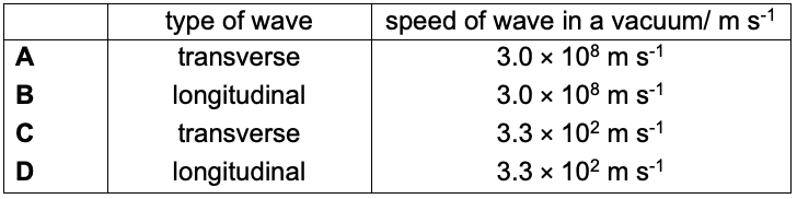 Revision: Electromagnetic Waves Report a question What's wrong with this question? You cannot submit an empty report. Please add some details. 11 Electromagnetic Waves - Revision Quiz Test your understanding of EM Waves here: 1 / 5 1) Which type of electromagnetic waves is used in satellite communication? Radio waves Microwaves Infrared rays Gamma rays 2 / 5 2) Microwaves are a type of electromagnetic radiation. Which is correct for microwaves? B A D C 3 / 5 3) 2017 S4 EOY P1 Q16 Given that the frequency of a radio wave is 1.3 kHz in vacuum and the speed of light in vacuum is 3.0 × 108 m s–1, what is the wavelength of this radio wave? 3.9 × 105 m 3.9 × 108 m 2.3 × 108 m 2.3 × 105 m 4 / 5 4) What is a property of all electromagnetic waves? They are deflected by magnetic fields. They all travel at the speed of sound. They are able to travel through vacuum. They are electrically charged. 5 / 5 5) Which of the following lists the types of electromagnetic radiation in order of increasing wavelengths? microwave, ultra-violet, infra-red, X-ray, visible light ultra-violet, infra-red, visible light, X-ray, microwave X-ray, ultra-violet, visible light, infra-red, microwave ultra-violet, visible light, infra-red, microwave, X-ray Your score is Restart quiz