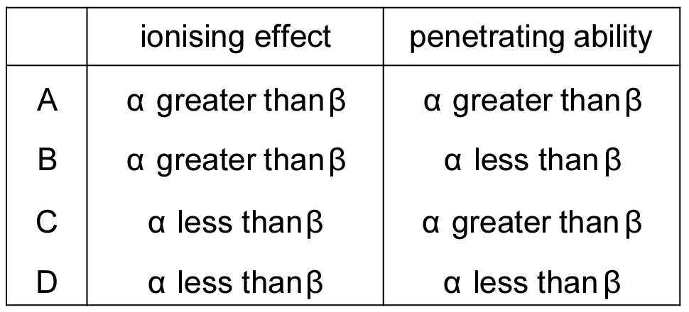 Revision: Radioactivity Report a question What's wrong with this question? You cannot submit an empty report. Please add some details. 21 Radioactivity - Revision Quiz Test your understanding of Radioactivity here: 1 / 5 1) Which nuclear equation correctly shows the decay of Radium-226 via alpha decay? 2 / 5 2) Which material should be used to line a box for storing radioactive substances emitting γ radiation? lead aluminium plastic graphite 3 / 5 3) In a fission reactor, which particle causes a Uranium-235 nucleus to split? proton alpha-particle gamma ray neutron 4 / 5 4) A powder contains 400 mg of a radioactive material that emits α-particles. The half-life of the material is 5 days. What mass of that material remains after 10 days? 100 mg 0 mg 40 mg 200 mg 5 / 5 5) Which row shows the relative ionising effects and penetrating abilities β-particles? C A B D Your score is Restart quiz