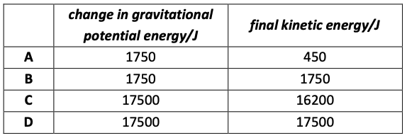 Revision: Work, Energy & Power Report a question What's wrong with this question? You cannot submit an empty report. Please add some details. 08 Work, Energy & Power - Revision Quiz Test your understanding of Work, Energy & Power here: 1 / 5 1) A child slides down a slide. The weight of the child is 250 N. The height of the slide is 7.0 m. The work done against friction as the child travels down the slide is 1300 J. What is the change in gravitational potential energy and what is the final kinetic energy of the child? B A C D 2 / 5 2) A small emergency generator supplies 4.32 × 108 J of electrical energy in 24 hours. What is the average power output of the generator? 5000 W 432 000 000 W 18 00 000 W 300 000 W 3 / 5 3) A young child holds a ball over the edge of a balcony. The ball possesses gravitational potential energy. The ball is released, falls on to a concrete path below, and bounces back up. Which sequence represents, in the correct order, the transformations of the gravitational potential energy after the ball is released? ---> kinetic energy ---> gravitational potential energy ---> elastic potential energy ---> elastic potential energy ---> kinetic energy ---> elastic potential energy ---> elastic potential energy ---> kinetic energy ---> chemical potential energy ---> kinetic energy ---> elastic potential energy ---> kinetic energy 4 / 5 4) 2023 S3 EOY P1 Q26 A girl of weight 600 N runs up a flight of stairs in 12 s. The vertical height of the flight of stairs is 3.0 m. What is the average power developed by the girl? 1 800 W 21 600 W 0.0067 W 150 W 5 / 5 5) A car of mass m has an engine which can deliver power P. What is the minimum time in which the car can be accelerated from rest to a speed v? Your score is Restart quiz